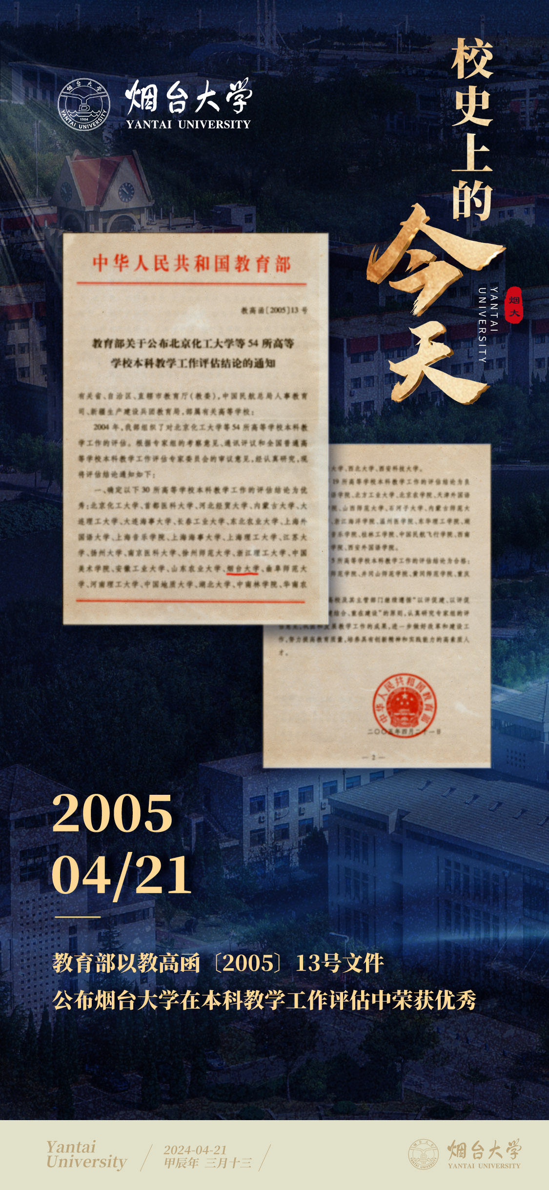 2005年4月21日,教育部以教高函〔2005〕13號(hào)文件下發(fā)《教育部關(guān)于公布北京化工大學(xué)等54所高等學(xué)校本科教學(xué)工作評(píng)估結(jié)論的通知》。通知中提到,根據(jù)專家組的考察意見、通訊評(píng)議和全國普通高等學(xué)校本科教學(xué)工作評(píng)估專家委員會(huì)的審議意見,經(jīng)認(rèn)真研究,確定煙臺(tái)大學(xué)本科教學(xué)工作的評(píng)估結(jié)論為優(yōu)秀。
