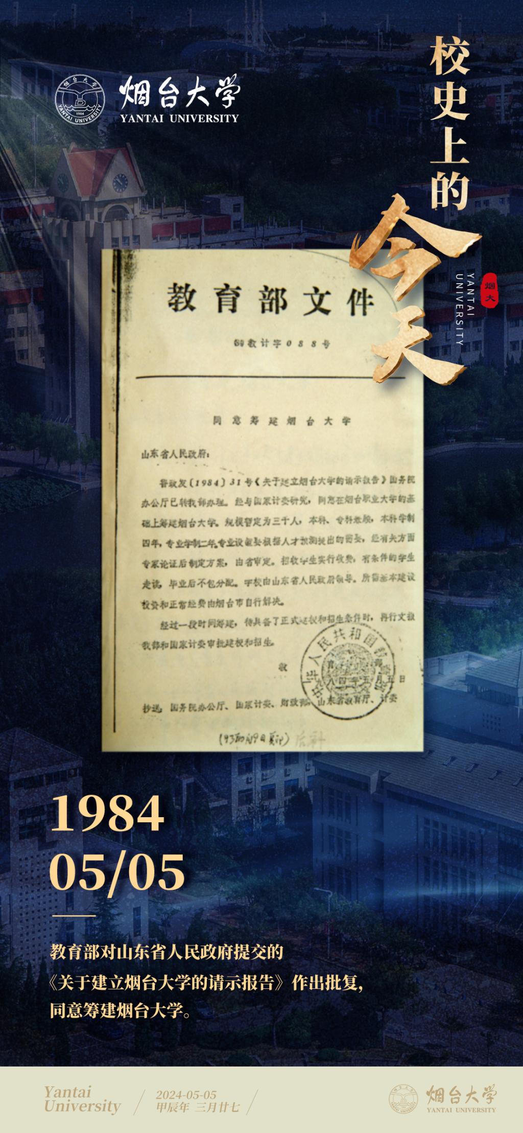 【編者按】2024年是新中國成立75周年,也是煙臺大學建校40周年。40年來,誕生于改革開放時代大潮中的煙臺大學,植根齊魯文化沃土,傳承北大清華基因,弘揚改革開放精神,勇擔教育強國使命,書寫了一段段滋蘭樹蕙的育人故事,譜寫了一曲曲乘風破浪的奮進贊歌。為慶祝煙臺大學建校四十周年,新聞中心(融媒體中心)推出“校史上的今天”欄目,以時間為線索,擷取煙大建校發展史上具有代表意義的重大事件,重溫閃耀在歷史長河中的昔年今朝,追憶在鹽堿灘上白手起家、艱苦創業的崢嶸歲月,展現辦學歷程中取得的新發展成就,啟迪新時代煙大人在新征程中再創新輝煌。