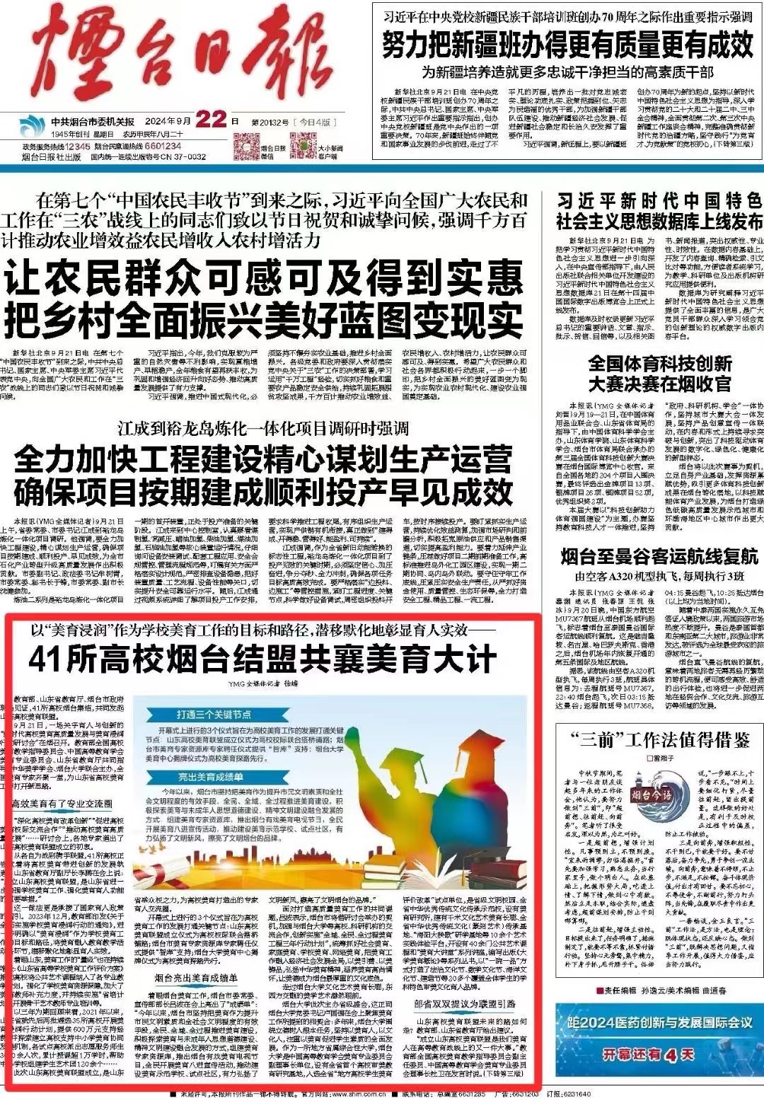 《煙臺日報》9月22日頭版刊發《41所高校煙臺結盟共襄美育大計》報道