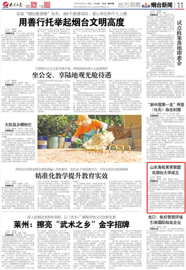 《大眾日報》9月25日11版刊發《山東高校美育聯盟在煙臺大學成立》