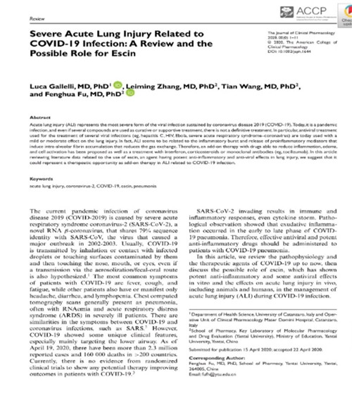 近日,煙臺大學分子藥理和藥物評價教育部重點實驗室傅風華教授、張雷明博士、王天博士基于實驗室長期抗炎藥物研究成果,與意大利學者聯(lián)合完成的“Severe acute lung injury related to COVID-19 infection: a possible role for escin”在美國《Journal of Clinical Pharmacology》(臨床藥理學)雜志在線發(fā)表。該成果詳細總結了團隊多年在七葉皂苷抗炎研究方面的積累,分析評述了其在新冠肺炎(COVID-19)治療方面的可能應用,以及盡早聯(lián)合使用強效抗炎藥物(無免疫抑制作用)和有效抗病毒藥物的重要性。