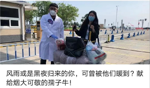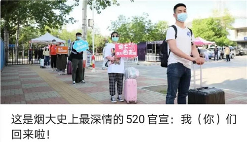 可是,這場疫情的突然來襲與防控任務的復雜嚴峻,使我們不得不放棄了很多原有的儀式——讓你終生難忘的畢業典禮無法舉行、讓你笑著哭著的畢業晚會被迫取消、讓你情感釋放的大規模聚餐不能開展……,甚至有些同學未能返回學校再走一遍他們深愛的煙園,再見一面他們喜愛的師長,再抱一次他們可愛的伙伴,再留一張“一個都能不少”的合影。看上去,2020年畢業的你們,的確少了很多東西,多了不少遺憾。然而,這些儀式的消失沒能阻擋那些意味深長、真情流露的“儀式感”,在這個特殊的畢業季以其他形式蔓延滋長。還記得“煙大史上最深情的520官宣”嗎?5月20日以來,由7828人組成的畢業生群體中,陸續有7420位同學在學校實行封閉化管控狀態下選擇了自愿返校,只為給自己的煙大生涯畫上一個圓滿的句號。