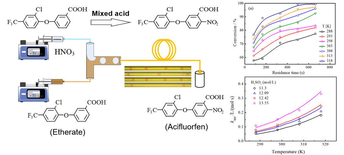 含氟二苯醚類除草劑具有廣譜、高效、低毒、低殘留等特點,已成為國內外除草劑的主流產品,市場前景廣闊。當前,工業生產的核心工藝(硝化過程)多采用間歇或半間歇釜式反應器,其非均相、快速強放熱的反應特性,導致過程安全性、產品品質及生產效率等面臨較大挑戰。