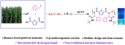 近日,我校化學化工學院秦玉升教授課題組利用糠醛生物基單體參與的Ugi多組分聚合反應高效制備了一系列結構可控的生物基聚酰胺。該反應具有無需催化劑、聚合條件溫和、反應原子經濟性高的突出優勢,并展示出了非傳統發光特性。該團隊針對糠醛基聚酰胺結構設計成功實現了產物的熒光可控,并對其應用進行了探索。本研究為多組分聚合產物應用提供了新的方向,也為聚酰胺熒光發光機制的研究提供了新思路。