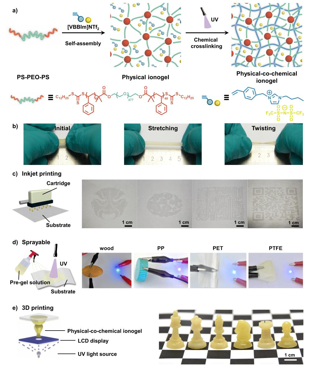 目前,新型柔性電子器件的發(fā)展趨向于結(jié)構(gòu)復(fù)雜化、定制化,作為其中的重要材料,離子凝膠的結(jié)構(gòu)性能和可加工性是實(shí)現(xiàn)這一目標(biāo)的關(guān)鍵。然而,目前制備高性能離子凝膠的方法,如引入雙網(wǎng)絡(luò)或非共價(jià)交聯(lián)等,通常基于常規(guī)的加工成型方法得到塊體凝膠,不利于在定制化器件中的應(yīng)用。設(shè)計(jì)制備兼具優(yōu)異的機(jī)械性能以及靈活的可加工性的高性能離子凝膠仍然是一項(xiàng)重大挑戰(zhàn)。