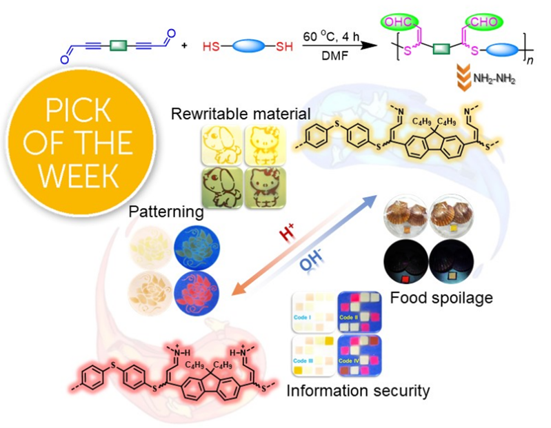 酸堿平衡是生物體賴以生存的關鍵,發展具有監測及調控酸堿狀態的新型功能材料對于食品、醫學、環境科學等領域具有重要研究和應用價值。近日,煙臺大學環境友好高分子團隊與華南理工大學秦安軍教授團隊合作,建立了一種無催化醛基活化內炔與巰基的點擊聚合,成功制備一系列多功能聚硫醚。利用該聚硫醚結構中的高反應性醛基及熒光芴基,不僅可實現肼的高靈敏、選擇性檢測;而且反應新生成亞胺鍵上的氮原子在不同酸堿環境中會發生可逆的質子化/去質子化反應,由此產生的分子內電荷轉移過程使得聚合物光物理性質發生系列變化,實現其在多色圖案化、復寫材料、四重信息加密及食品保鮮監測等多場景的應用。