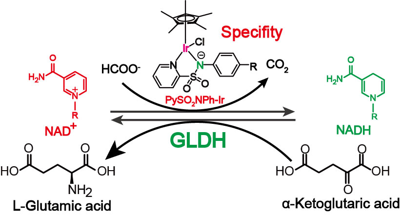 基于此,我校祁彩霞教授團隊在課題組前期開發(fā)的負氮型超高活性輔酶NADH再生吡啶酰胺有機銥催化劑PyCONPh-Ir的基礎上(Catalysis Science & Technology. 2021, 11, 7982-7991.),通過調(diào)變配體電負性,開發(fā)了一款新的吡啶磺酰胺型銥催化劑PySO2NPh-Ir,其不僅保留了對輔酶NADH超高的再生活性,且相較于吡啶酰胺型催化劑,其對于芳香醛、醌類化合物以及α-酮戊二酸的加氫活性均明顯較弱,展現(xiàn)了更出色的輔酶NADH再生選擇性,也更加適用于化學-酶級聯(lián)催化體系的構(gòu)建。進而,將有機銥催化劑PySO2NPh-Ir與L-谷氨酸脫氫酶GLDH相結(jié)合,實現(xiàn)了對L-谷氨酸的高效制備(圖1)。