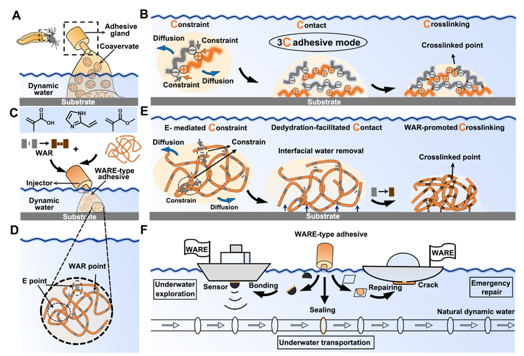 近日,化學化工學院劉洪亮教授團隊受海洋固著生物“3C”粘合模式的啟發,將高分子的纏結性與溶劑響應性結合,提出了一種水響應性纏結(WARE)的普適性概念,并據此構建了一系列動態水環境適用的水下粘合劑。結果顯示,此類粘合劑可以通過仿3C粘合流程,即分子纏結介導的分子損失抑制,充分去水化促進的水下界面接觸以及溶劑響應引發的水下高效交聯,從而完成動態水環境中的粘合過程,并在動態水環境中實現高強水下粘合。此外,由于簡單的合成策略及獨特的粘合模式,WARE粘合劑還表現出一系列適用于實際應用的性能,如:大量生產能力,長期儲存性,按需解粘附性及循環利用性。WARE粘合劑憑借其優異的動態水中粘合能力,可以簡化水下探測過程,修復破損船只以及封堵泄漏的水下運輸管道,具有廣闊的應用前景。