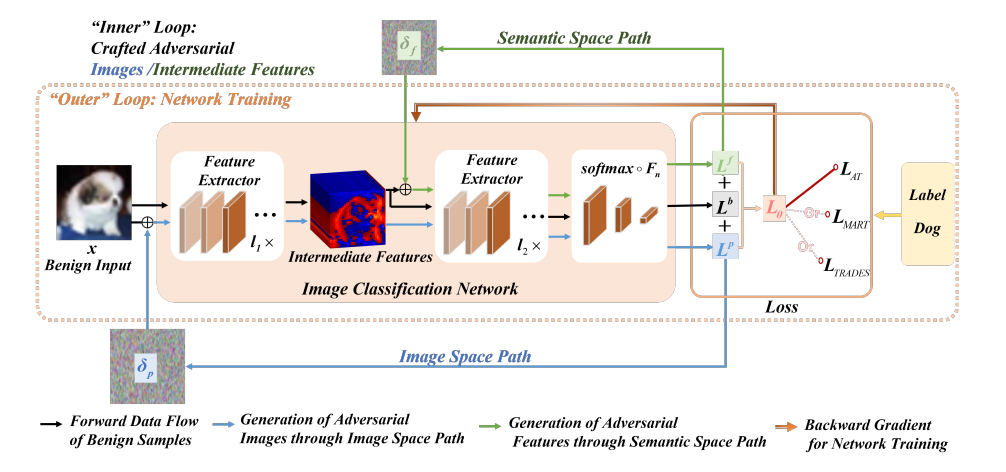 研究成果以“ISDAT: An Image-Semantic Dual Adversarial Training Framework for Robust Image Classification”為題發(fā)表在國(guó)際權(quán)威期刊《Pattern Recognition》(中科院一區(qū)Top,影響因子8.4)上。該工作第一作者為隋晨紅副教授,第二作者是物理與電子信息學(xué)院2021級(jí)碩士研究生王奧,煙臺(tái)大學(xué)為第一單位。該工作受到了國(guó)家重點(diǎn)研發(fā)計(jì)劃項(xiàng)目、國(guó)家自然科學(xué)基金項(xiàng)目和中國(guó)博士后科學(xué)基金項(xiàng)目的資助。