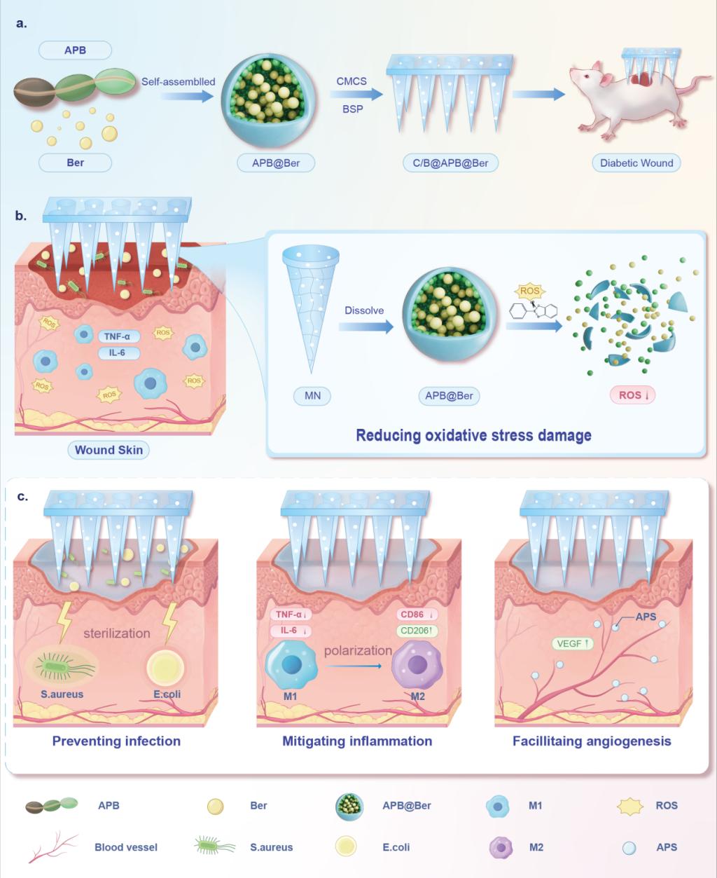圖1.負載APB@Ber的MNs貼劑促進傷口愈合的示意圖。
