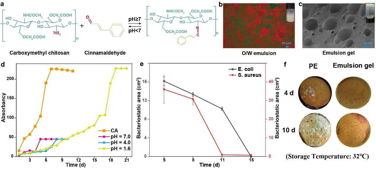 圖2. a.乳液界面處的Schiff Base反應;b.水包油乳液的顯微鏡染色圖像(油相:Nile Red); c.乳液凝膠的掃描電子顯微鏡圖像;d. pH響應的肉桂醛釋放;e.乳液凝膠的抗菌性能;f.抗菌乳液凝膠用于龍眼保鮮。