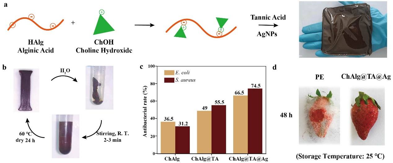 圖1. a.基于非共價相互作用制備自支撐抗菌薄膜;b.抗菌薄膜的可循環性;c.抗菌薄膜的抗菌性能;d.抗菌薄膜用于草莓保鮮。