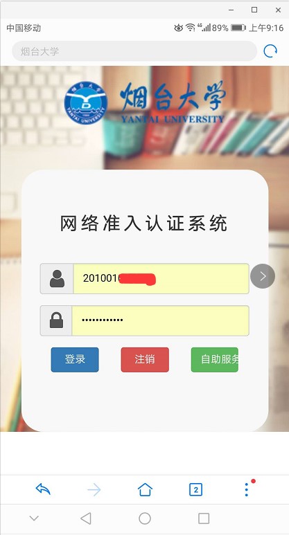 校園無線采用web認證,連接YTU后,打開瀏覽器會自動轉到下圖所示的認證頁面(有的瀏覽器不允許自動轉到認證頁面,這時需要手工在瀏覽器中打開煙臺大學官網http://www.eknmzjl.com,點擊右下角的“計費系統”);