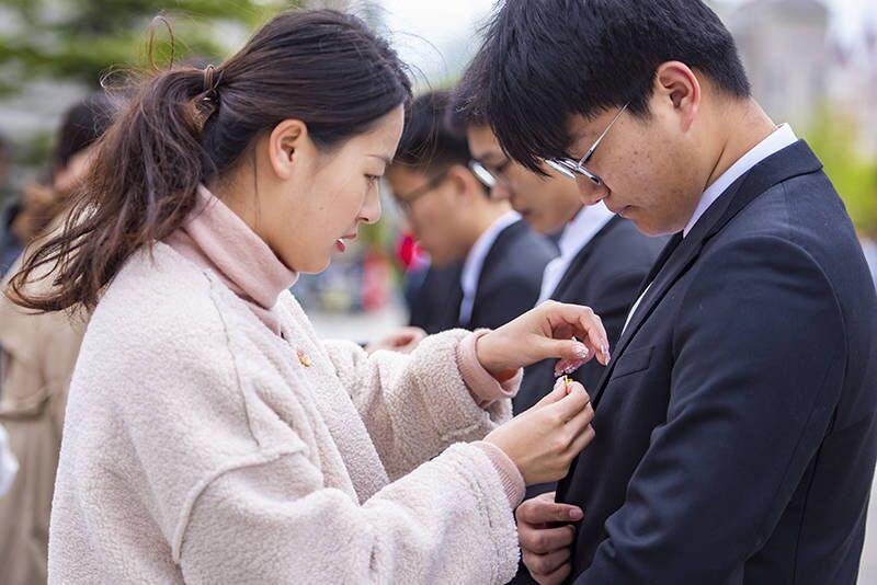 儀式在雄偉的國歌聲中開始。團委副書記丁曉丹宣布了煙臺大學2023年新發展團員名單。85名2023年新發展團員面向團旗,共同宣誓,誓言錚錚,彰顯著新團員積極向上的精神風貌。誓言鏗鏘,展現著團員們的堅定決心。各學院團委負責人為新團員頒發團員證并佩戴團徽,將共青團員的使命和擔當交到新團員的手上,同時也向新團員們表示由衷地祝賀。新團員代表建筑學院繩曉菲同學,代表全體新團員承諾,必將做到信念堅定,勇于擔當,做好“五個模范”,努力成為優秀的新時代共青團員。朗誦《國旗下的誓言》,“青春萬歲,祖國萬歲!”的吶喊鏗鏘有力,展現了煙大青年為青春而奮斗,為共產主義而奮斗的決心和信心。