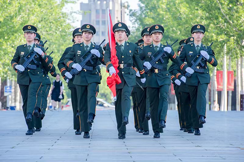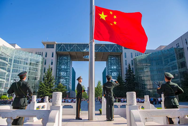 伴隨著鐘樓的第七聲鐘響,學校國旗護衛隊隊員迎著東方日出的方向,邁著整齊劃一的步伐,護衛國旗走向升旗臺。升旗手振臂一揮,五星紅旗伴隨著國歌聲冉冉升起。師生們面向國旗肅立行注目禮,高唱國歌,共同感受這一莊嚴而自豪的時刻。