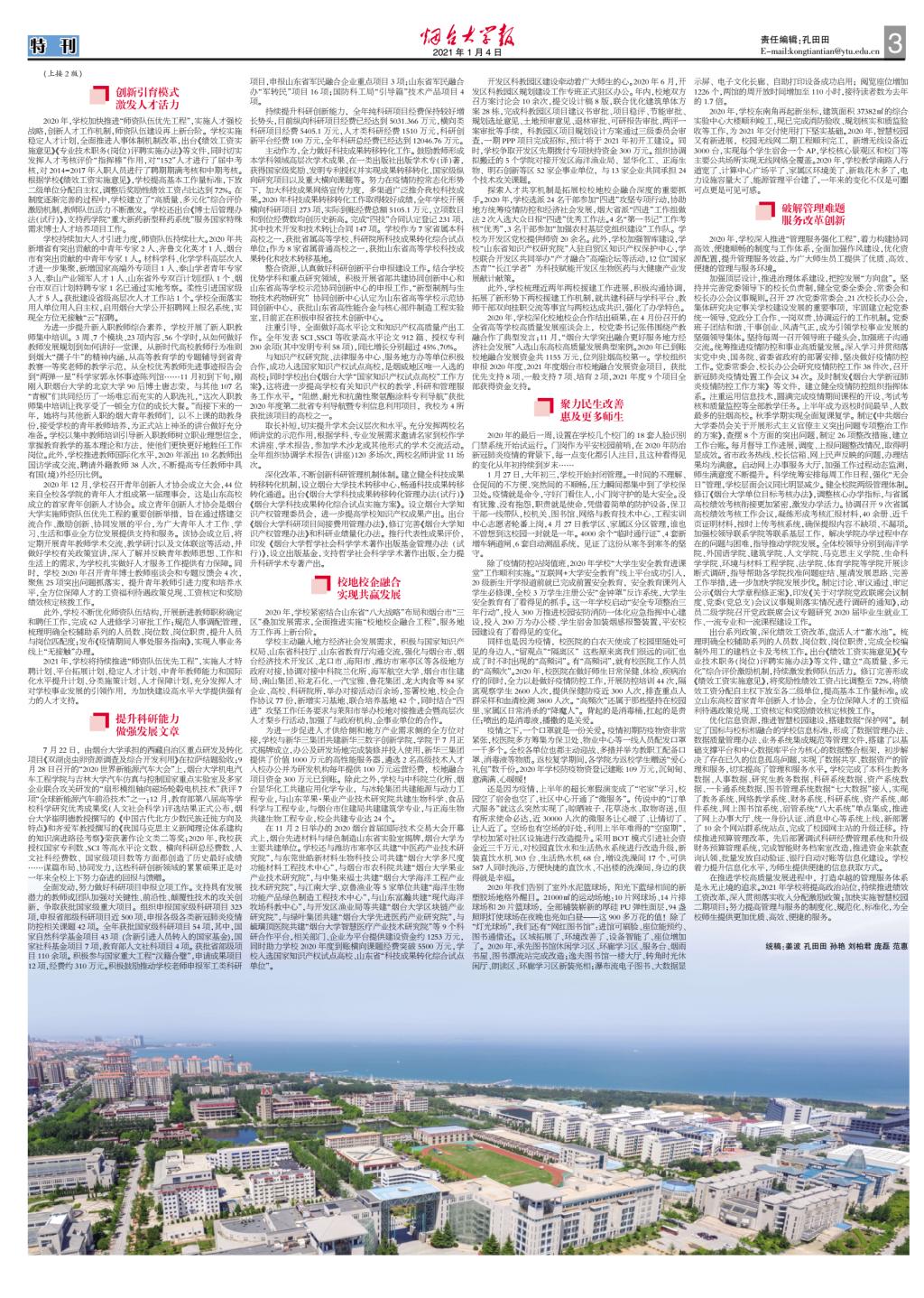 編者按:2020年是煙臺(tái)大學(xué)高質(zhì)量發(fā)展的關(guān)鍵一年。學(xué)校成立九個(gè)工作專班,負(fù)責(zé)組織、推動(dòng)、落實(shí)學(xué)校高質(zhì)量發(fā)展九項(xiàng)工程工作任務(wù)。一年來(lái),學(xué)校在黨建思政引領(lǐng)、本科質(zhì)量提升、育人體系深化、學(xué)科建設(shè)突破、師資隊(duì)伍優(yōu)先、科學(xué)研究創(chuàng)新、校地校企融合、民生改善幸福、管理服務(wù)強(qiáng)化等九個(gè)方面全面發(fā)力協(xié)調(diào)推進(jìn),取得明顯成效。為充分展示學(xué)校2020年取得的突出成績(jī),近日特推出“2020年煙臺(tái)大學(xué)高質(zhì)量發(fā)展九項(xiàng)工程全面盤點(diǎn)”,以激勵(lì)號(hào)召全校上下堅(jiān)定信心、凝心聚力、深化改革、加壓奮進(jìn),努力開(kāi)創(chuàng)學(xué)校各項(xiàng)事業(yè)發(fā)展新局面,以嶄新的面貌迎接中國(guó)共產(chǎn)黨成立100周年。