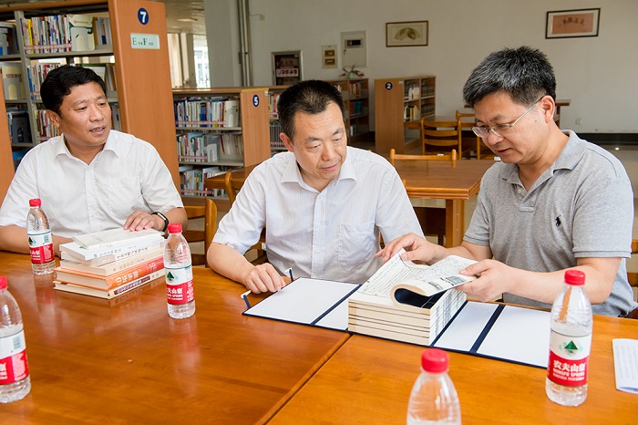 7月14日下午,我校校友、省政府辦公廳黨組成員、省史志辦主任劉愛軍再次向學校贈送了一批珍貴圖書,包括《山東省歷代方志集成(府州志)》、《山東省歷史地圖集》、《山東年鑒2017》、《山東簡史》、《生態文明與環境立法》以及《生態文明概論》等。學校黨委副書記張偉代表學校接受捐贈,對劉愛軍長期以來支持幫助學校發展表示衷心感謝。山東省史志辦市縣基層志編纂指導處處長李剛、山東省方志館館長李坤以及學校辦公室、圖書館、海洋學院和校友辦有關負責人參加了贈書儀式。