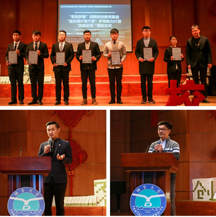 活動現場揭曉了由張國臣、朱曉磊、張成建三位校友共同設立的法學院“零壹夢想”創新創業教育基金面向全校舉辦的“我在煙大有個夢”——2017煙大學生夢想助力計劃的資助名單,法學院大一新生馮建東的“詩集出版”、煙臺大學創行團隊的“‘果落菌生’助農產業轉型”、化院海燕團隊的“季銨鹽型超支化聚硫醚對于織物的改性”、化院啟夢團隊的“筆芯回收”、法學院哈哈法律援助團的“山區留守兒童普法”、建筑學院遇建團隊的“鄉村建筑工作室”、煙臺大學書畫協會的“校園內傳統文化感受碑廊”、人文學院大四學生李海翔的“小說出版”等8個夢想計劃獲得資助。張成建校友為他們頒發資助證書。來到活動現場的7位受資助的“夢想者”以3分鐘演講的形式展示了他們的夢想計劃。隨后,朱曉磊校友上臺致辭,講述了“零壹夢想基金”的緣起,并鼓勵同學們一定要堅持夢想,希望受資助者在有能力的時候,也能以這樣的方式回饋母校。