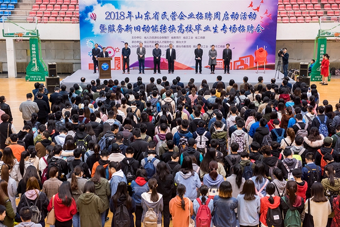 馬淑臣介紹了煙臺經濟發展特點,特色產業布局,以及民營企業在吸納畢業生就業所做的貢獻。山東省公共就業人才服務中心副主任金魯峰在致辭中強調,民營經濟占山東省經濟總量的半壁江山,政府四個部門聯合高校啟動民營企業招聘周活動,搭建人才交流平臺,幫助企業覓得人才,助推新舊動能轉換,非常有意義。煙臺杰瑞石油服務集團副總裁謝猛介紹了企業發展情況和在人才招聘、培養方面的典型經驗。