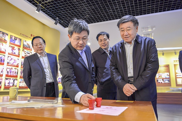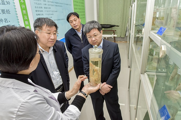 徐少寧一行首先來到校史館,聽取黨委書記張偉對學校發展情況介紹。煙臺大學伴隨改革開放誕生,時任國務院副總理的萬里同志提出:“可以搞一個不要‘鐵飯碗’的大學,就叫煙臺大學。”在北大、清華的援建下,煙臺大學從建設到招生僅僅用了一年時間,徐少寧對“煙大速度”頻頻點頭,對起點高、發展快、勢頭好的煙大表示贊賞,對煙大為煙臺發展做出的貢獻表示感謝。隨后,徐少寧一行來到千米文化長廊,看到長廊全景式地再現了中西藝術的發展歷程,引領師生在藝術畫卷中追溯歷史、感悟藝術時,徐少寧對煙大的文化建設給予充分肯定。在海洋學院水生生物實驗室、藥學院實驗室、工程實訓中心創客空間,徐少寧不時與師生交流,對學校堅持把立德樹人作為中心環節,堅持立足煙臺、服務煙臺,推進產學研緊密結合表示贊賞。