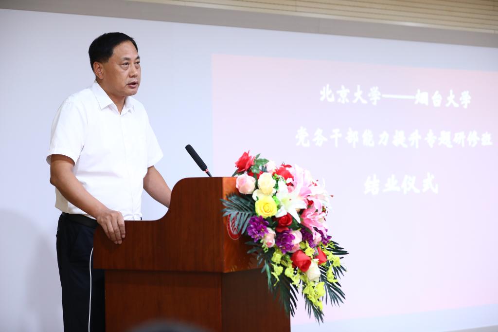 【本站訊】為深入推進(jìn)學(xué)習(xí)貫徹習(xí)近平新時代中國特色社會主義思想主題教育,進(jìn)一步增強(qiáng)干部的政治能力、黨性修養(yǎng)和專業(yè)能力,8月1日至5日,煙臺大學(xué)黨務(wù)干部能力提升專題研修班在北京大學(xué)舉行。黨委書記張殿臣出席并講話,黨委副書記郭建國作開班動員,黨委常委、副校長郝曙光,黨委常委、組織部部長王澤光,黨委常委、宣傳部部長于秀國,各基層黨委、黨總支書記,有關(guān)部處室主要負(fù)責(zé)人參加了集中培訓(xùn)。北京大學(xué)教育學(xué)院黨委書記張曉黎、院長閻鳳橋,北京大學(xué)黨委組織部副部長、黨校辦公室主任張洪峰先后出席開班和結(jié)業(yè)儀式。