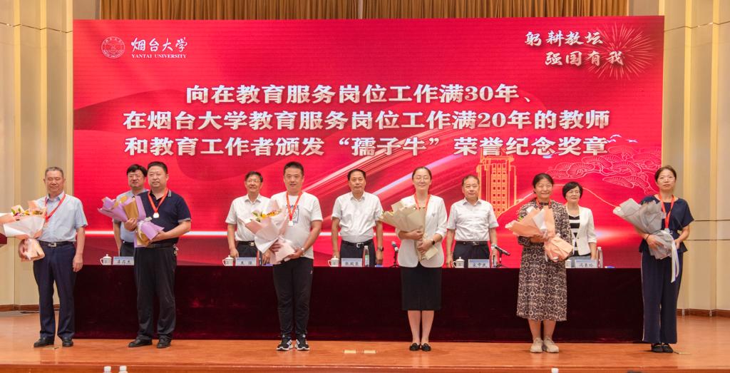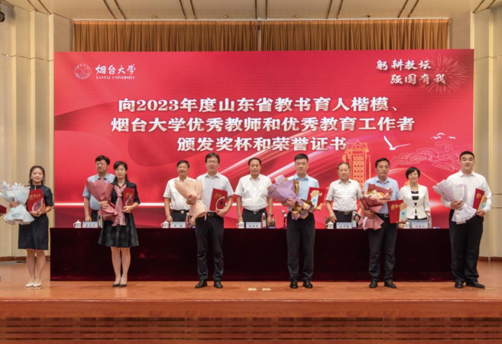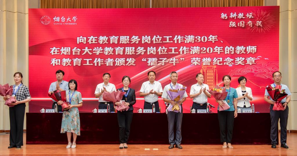 “今天,我們向最美園丁致敬,致敬一種精神叫做甘為人梯,堅實的臂膀托舉學生攀登新的高峰;致敬一種美德叫做甘化春蠶,杰出的才能讓知識與智慧延展……”今年,煙大學子為致敬辛勤培育他們的老師,特原創一首節日獻詞,并由學生代表在教師節慶祝大會上現場朗誦,送上他們最真摯的感謝與祝福。此外,來自全國各地的校友代表、在校學生代表也通過視頻的方式,向老師致以節日的問候和祝福,表示將不忘教誨、砥礪前行,在本職崗位上兢兢業業、發光發熱,為全面建成社會主義現代化強國貢獻力量。隨后,受表彰和激勵的老師滿懷幸福喜悅的心情,在全場熱烈的掌聲中上臺接過獎杯和證書、佩戴榮譽紀念獎章,學生代表獻上美麗的鮮花表達對老師們最誠摯的敬意。