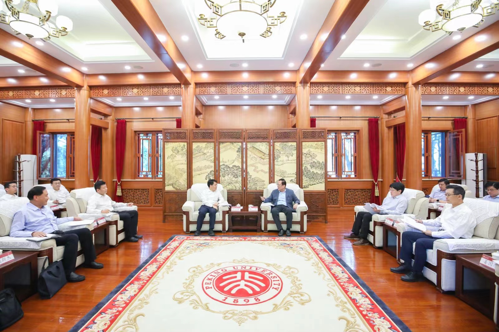 【本站訊】9月13日上午,山東省人民政府副省長(zhǎng)、省政府黨組成員鄧云鋒訪問(wèn)北京大學(xué),山東省委教育工委常務(wù)副書(shū)記,教育廳黨組書(shū)記、廳長(zhǎng)李明,山東省教育廳總督學(xué)王浩,煙臺(tái)大學(xué)黨委書(shū)記張殿臣,煙臺(tái)大學(xué)黨委常委、副校長(zhǎng)郝曙光陪同。北京大學(xué)黨委書(shū)記郝平,黨委常委、副校長(zhǎng)、總務(wù)長(zhǎng)董志勇會(huì)見(jiàn)鄧云鋒一行。雙方就全面推進(jìn)校地合作、扎實(shí)做好新形勢(shì)下北京大學(xué)援建煙臺(tái)大學(xué)等事宜進(jìn)行了深入交流。