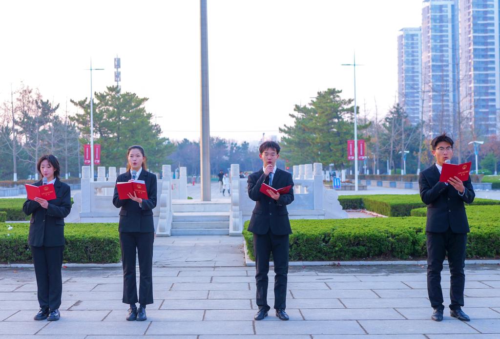 上午7時,五星紅旗伴隨著雄壯的國歌聲在國旗廣場升起?!氨緫椃ㄒ苑傻男问酱_認(rèn)了中國各族人民奮斗的成果,規(guī)定了國家的根本制度和根本任務(wù),是國家的根本法,具有最高的法律效力……”師生代表們共同進行了憲法晨讀,齊聲朗讀憲法條文,用心體悟憲法精神。法學(xué)院學(xué)生合唱歌曲《憲法伴我們成長》,歌聲嘹亮,旋律輕快,青春的聲音詮釋著對憲法的崇敬。學(xué)生代表邵姿怡、石子岳依次進行演講和宣誓,暢談內(nèi)心感悟,共傳法治精神。