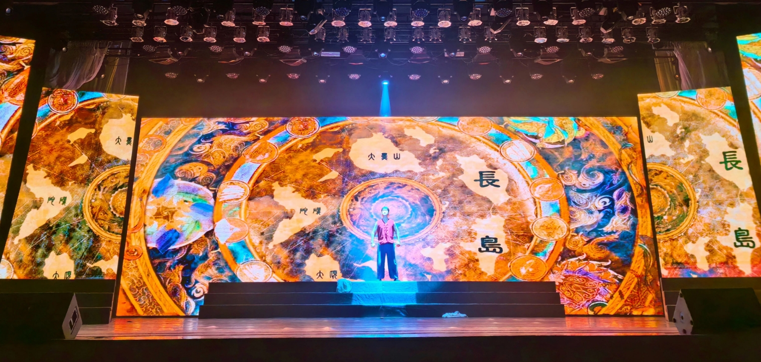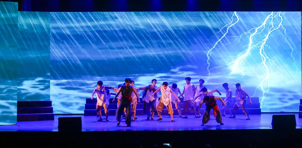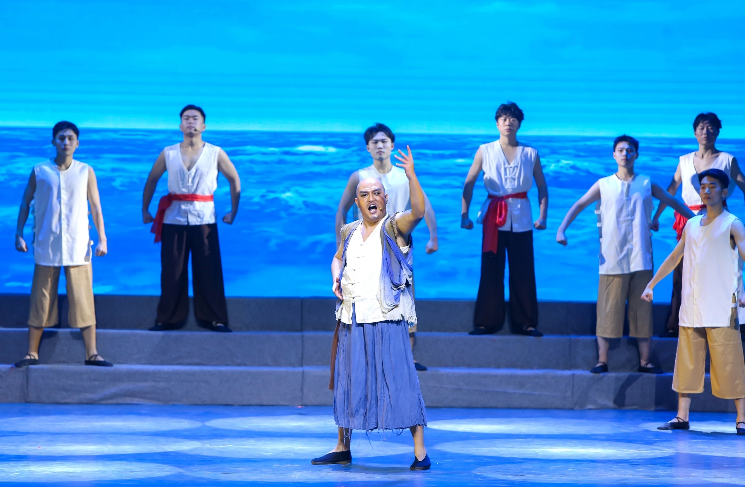 原創音樂劇《長島漁號情》取材于長島漁民的故事,講述了船老大帶領船員們勇敢闖海的故事。全劇包含“老大漁號起”“情繞海島間”“闖海生死場”“凱旋歸來時”四個篇章,塑造了船老大、少年母親、少年、少女、船員們等一系列鮮活的人物形象,真實再現了幾百年來長島人民耕海牧漁、踏浪而歌的勞作場景。該劇通過極具地域特色的角色塑造、極富感染力的傳統音樂和濃郁的膠東風格舞美設計,依托美輪美奐的視覺特效營造出沉浸式的舞臺情境,對母子情、父女情、愛情以及出生入死的兄弟情和超越生死的師徒情進行了細致刻畫,藝術性地展現了長島的歷史厚度、文化深度和精神高度,讓現場觀眾在光影變幻和音符起伏中,體悟闖海精神的強大力量。