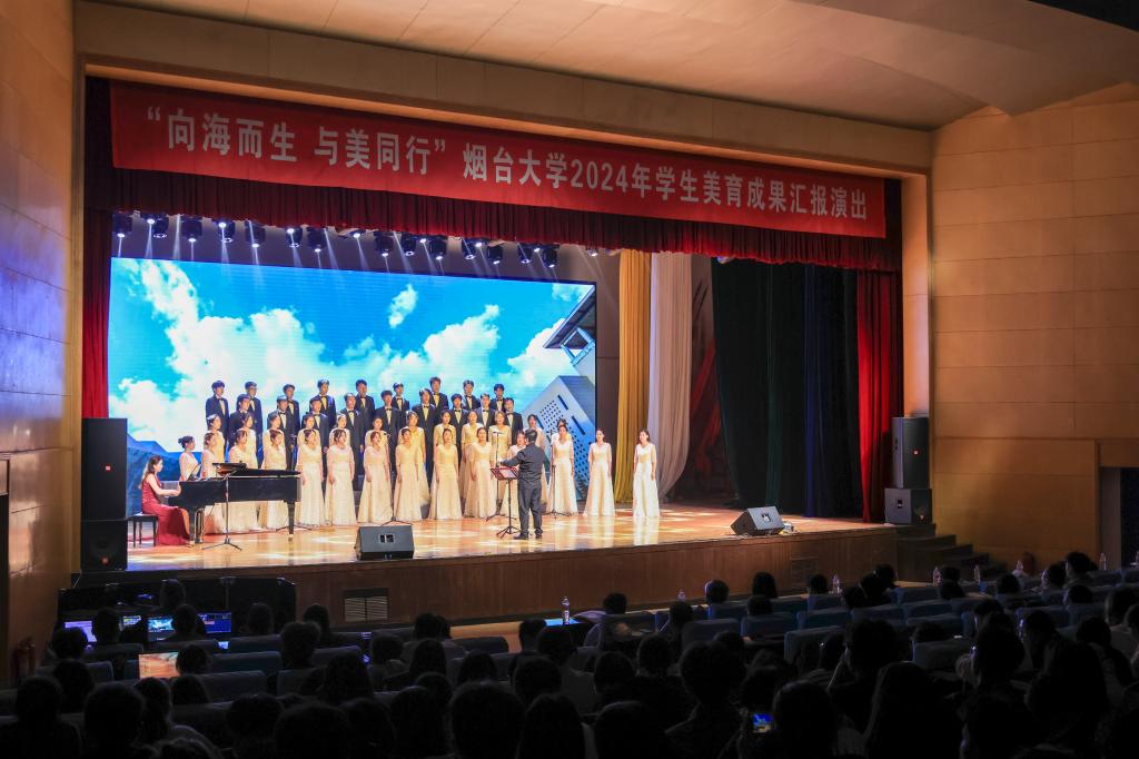會議期間,與會領導、專家和聯盟單位代表還參觀了煙臺大學文化藝術美育長廊,觀看了“向海而生 與美同行”——煙臺大學2024年學生美育成果匯報演出。