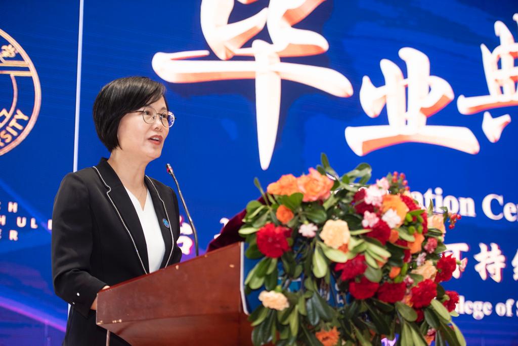 本次典禮以“初心·啟航—礪行·碩果—致遠·星辰”為主線。郝曙光向學院2025屆畢業生致以衷心祝賀,勉勵同學們以創新精神開辟可持續發展新航道,以責任擔當堅守地球公民價值觀,以開放合作推動人類命運共同體建設,努力成長為具有全球視野的可持續發展創新人才。Dorit Schumann指出,中德合作辦學模式下培養的跨文化視野、創新思維和可持續發展理念,將成為畢業生應對未來挑戰的獨特優勢,期待他們以自信的姿態踏上新征程,將知識和能力運用到推動全球可持續發展的實踐中去。