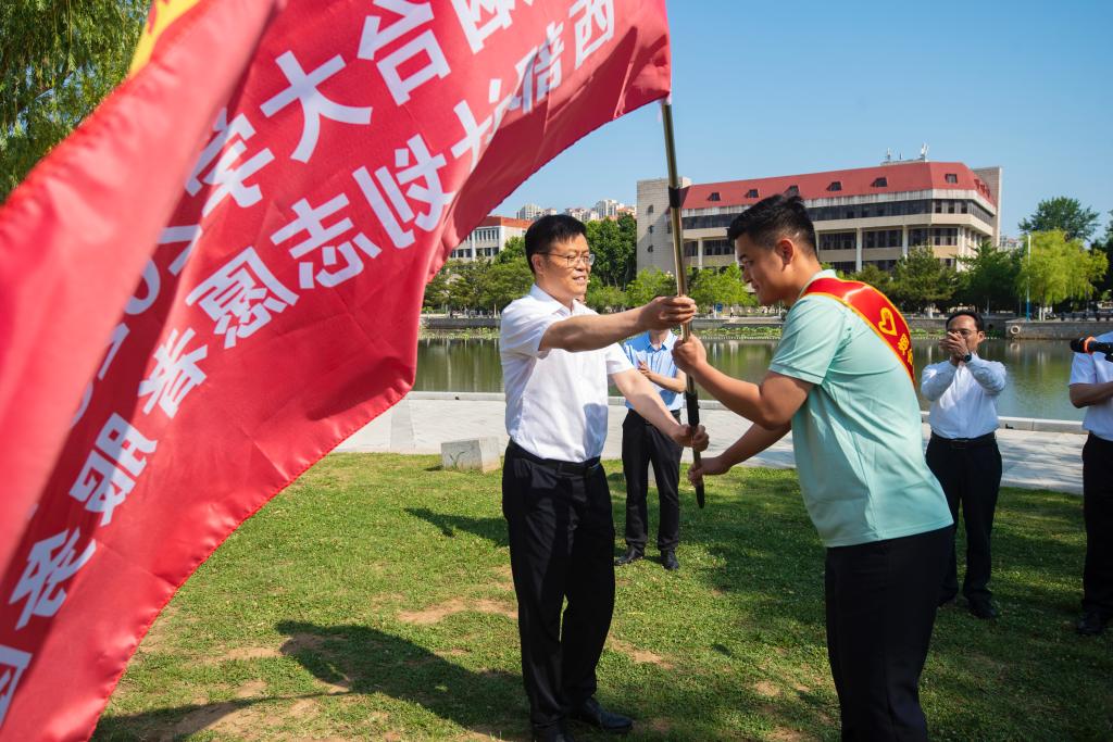 儀式現場,學校領導老師為志愿者逐一頒發綬帶。志愿者代表緊握右拳莊嚴宣誓,表達了沖鋒在前、投身西部的決心和奉獻祖國、實現自我的強烈意愿。盧國強為2025年西部計劃志愿者服務團授旗。