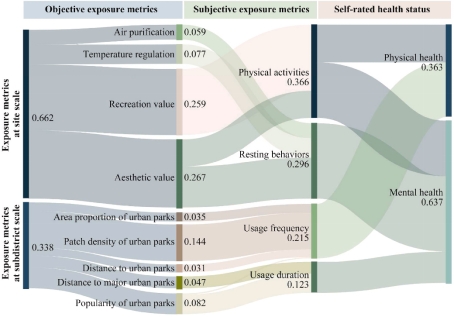 該研究面向城市化發(fā)展帶來的人口增長(zhǎng)和土地利用變化及公共衛(wèi)生壓力等環(huán)境問題,旨在通過探究多尺度視角下城市綠地暴露對(duì)居民健康福祉的影響機(jī)理,為通過城市綠地規(guī)劃管理實(shí)踐建設(shè)健康人居環(huán)境提供科學(xué)依據(jù)。該研究構(gòu)建了聯(lián)系不同空間尺度下客觀與主觀綠地暴露及居民自評(píng)健康狀況的概念模型,并以公園綠地這一關(guān)鍵城市綠地類型為例,通過橫斷面研究驗(yàn)證模型假設(shè)和構(gòu)建量化路徑。研究結(jié)果表明,場(chǎng)地和社區(qū)尺度下綠地暴露特征均對(duì)居民自評(píng)健康狀況有顯著的積極影響,但綠地暴露對(duì)健康福祉的貢獻(xiàn)因空間尺度而異,其中場(chǎng)地尺度綠地暴露對(duì)健康福祉影響的總體重要性更高;在不同空間尺度下的綠地暴露特征中,場(chǎng)地尺度下綠地美學(xué)價(jià)值通過促進(jìn)居民靜態(tài)行為對(duì)心理健康的貢獻(xiàn)最大,社區(qū)尺度下綠地可獲得性通過提高居民的綠地使用頻率對(duì)身體健康的貢獻(xiàn)最大(圖1)。